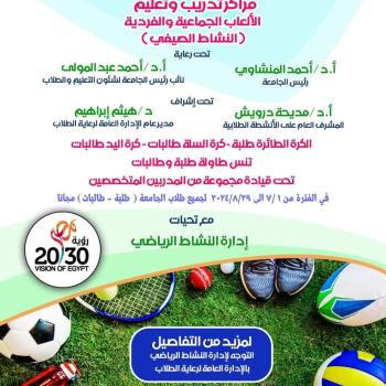 إدارة النشاط الرياضي بالإدارة العامة لرعاية الطلاب دعوه لمشاركة طلاب الجامعة في مراكز التدريب وتعليم الألعاب الجماعية والفردية (النشاط الصيفي)