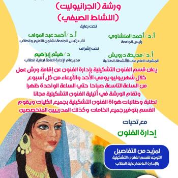 إدارة الفنون بالإدارة العامة لرعاية الطلاب دعوة لمشاركة الطلاب في ورشة (الجرانيوليت) ضمن أنشطه (النشاط الصيفي) بالإدارة العامة لرعاية الطلاب