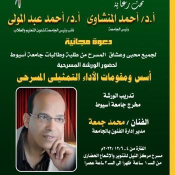 دعوة مجانية . إدارة الفنون .. لجميع محبى وعشاق المسرح من الطلبة وطالبات جامعة اسيوط لحضور الورشة المسرحية " اسس ومقومات الاداء التمثيلى المسرحى "