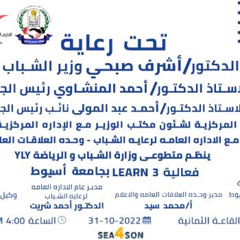 تنظم الإدارة المركزية لشئون مكتب وزير الشباب والرياضة مع الإدارة المركزية لتنمية الشباب بالتعاون مع الإدارة العامة لرعاية الشباب- وحدة العلاقات العامة والإعلام "ينظم متطوعي وزارة الشباب والرياضة YLY فاعلية LEARN 3 بجامعة أسيوط