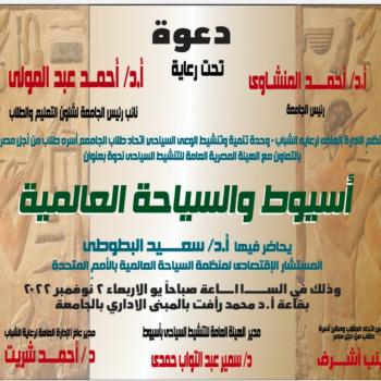 دعوة للحضور والمشاركة ...تنظم الاداره العامه لرعايه الشباب وحده تنميه وتنشيط الوعي السياحي- اتحاد طلاب الجامعه- اسرة طلاب من اجل مصر بالتعاون مع الهيئه المصريه العامه لتنشيط السياحي ندوه بعنوان اسيوط والسياحه العالميه