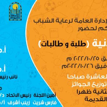 تنظم الادارة العامة لرعاية الشباب - إدارة النشاط الرياضى ... الدورة الرياضية التنشيطيه للعام الجامعي ٢٠٢٢/ ٢٠٢٣م وذلك خلال الفترة من ١٦ الى٣١ اكتوبر٢٠٢٢ م