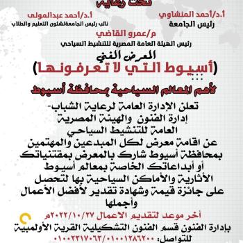 تعلن الادارة العامة لرعاية الشباب..ادارة الفنون والهيئة المصرية العامة للتنشيط السياحى عن اقامة المعرض الفني لكل المبدعين والمهتمين بعنوان "اسيوط التى لا تعرفونها" لاهم المعالم السياحية بمحافظة اسيوط ،شارك لتحصيل على جائزة قيمة وشهادة تقدير لاجمل الاعمال