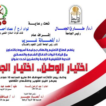 جامعة أسيوط تعقد غداً ندوة تثقيفية بالتعاون مع قيادة قوات الدفاع الشعبى والعسكرىة بعنوان " اختيار الوطن ... اختيار الجميع "