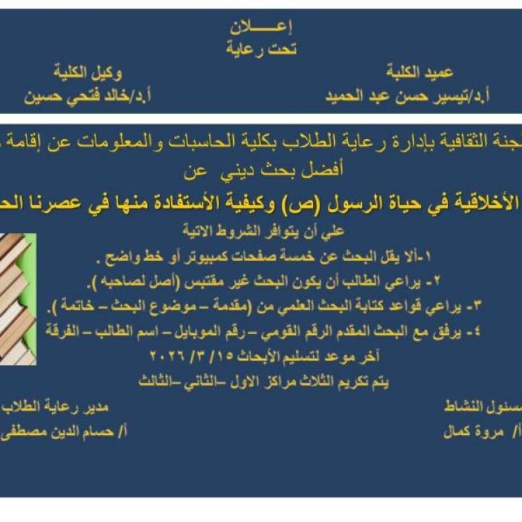 كلية الحاسبات والمعلومات ... تنظيم مسابقة أفضل بحث دينى بعنوان (القيم الأخلاقية فى حياة الرسول صلى الله عليه وسلم وكيفيه الاستفادة منها في عصرنا الحالي)