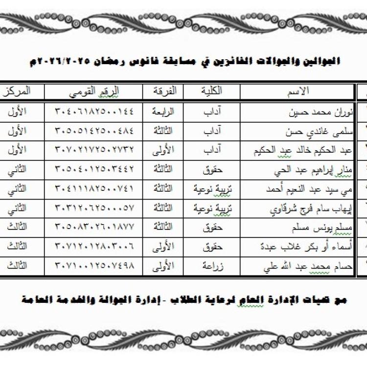 إدارة النشاط الثقافي ... تنظيم المسابقة الكبرى في حفظ وتجويد وتلاوة القرآن الكريم بنظام المستويات لطلبة وطالبات الجامعة وذلك خلال شهر رمضان الكريم