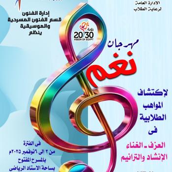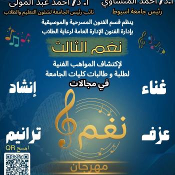 ينظم قسم الفنون المسرحية والموسيقية بإدارة الفنون الأدارة العامة لرعاية الطلاب " نغم الثالث " لإكتشاف المواهب الفنية لطلبة وطالبات كليات الجامعة فى مجالات " غناء - عزف - إنشاد - ترانيم "