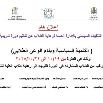 كلية طب الاسنان- الاعلان عن دورة تدريبية بعنوان التنمية السياسية وبناء الوعي الطلابي في الفترة من 19 اكتوبر حتي 22 اكتوبر