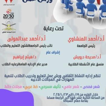 دعوة لمشاركة الطلاب والطالبات بكليات الجامعة المختلفة في ورش عمل لتعليم وتدريب الطلاب لتنمية المهارات في المجالات الاتية [ شعر فصحي _ شعر عامي _ تاليف مسرحي _ خط عربي _ مجلات حائط ] - إدارة النشاط الثقافي بالإدارة العامة لرعاية الطلاب