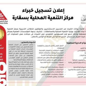 تعلن الإدارة العامة لرعاية الطلاب المشاركة وتسجيل خبراء مركز التنمية المحلية بسقارة فى التخصصات الفنية والإدارية