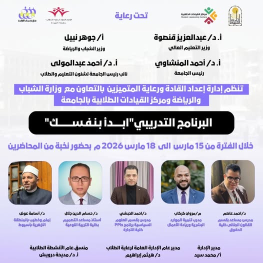 تنظم ادارة اعداد القادة بالإدارة العامة لرعاية الطلاب بالتعاون مع وزارة الشباب والرياضة ومركز القيادات الطلابية بالجامعة برنامج تدريبي تحت عنوان "ابدأ بنفسك" لطلاب الجامعة فى مجالات التأهيل للقيادة وتطوير الذات فى الفترة من 3/15 الى 3/18 ابتداءا من الساعة التاسعة والنصف صباحاً بقاعة حمام السباحة بالجامعة بحضور نخبة متميزة من المدربين