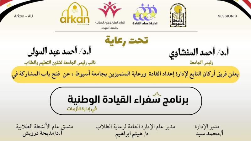 يُعلن فريق أركان المركزي التابع لإدارة إعداد القادة ورعاية المتميزين بالإدارة العامة لرعاية الطلاب بجامعة أسيوط عن فتح باب المشاركة في برنامج إدارة الأزمات وإعداد القادة في المجالات المختلفة « سفراء القيادة الوطنية »ويأتي البرنامج في إطار حرص الجامعة على دعم وتنمية القيادات الطلابية ، وتعزيز مهارات حل المشكلات والعمل الجماعي لتوفير بيئة عمل إبداعية تساهم في إبتكار الحلول وتنمية المهارات الذاتية للطلاب عبر ورش عمل  خلال الفترة من 15 مارس إلي 7 إبريل 2026 - بمشاركة نخبة من المدربين المعتمدين ، كما يتضمن البرنامج إقامة :