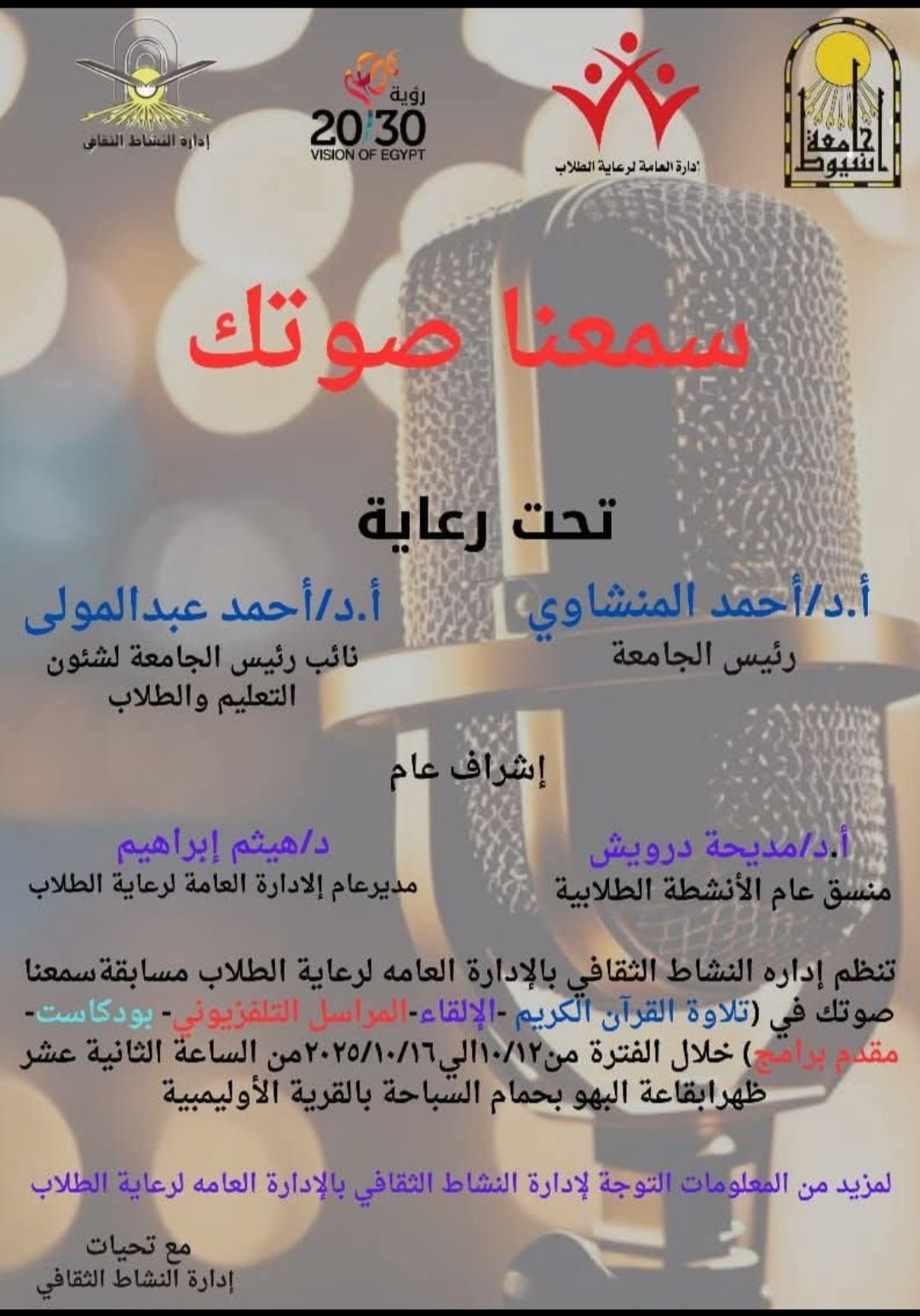 يــرجـي ســرعـة التوجـــه الي مكــتب السيد الاسـتاذ الدكــتور/ وكـيل الكلية لشئـون خـدمة المجتمـع وتنمية البيئة حتي يتسني لنا حصـر الاعــداد المشــاركة وتنظيـم الحفــل بالشكــل اللائــق.