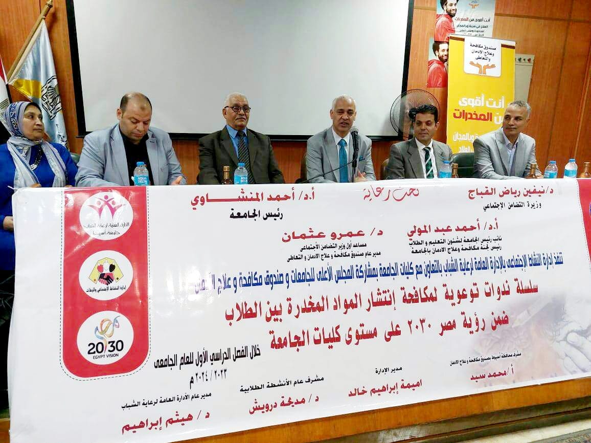 تحت رعاية الدكتور أحمد المنشاوي رئيس جامعة أسيوط؛ نظمت إدارة النشاط الاجتماعي، والرحلات، بالإدارة العامة لرعاية الشباب، اليوم الثلاثاء 14 من نوفمبر؛ ندوة تثقيفية، وتوعوية حول :"مكافحة انتشار المخدرات بين الطلاب"؛ لطلاب كلية الهندسة، وذلك بالتعاون مع وزارة التضامن الاجتماعي بمحافظة أسيوط، وبرئاسة الدكتورة نيفين القباج وزيرة التضامن الاجتماعي.
