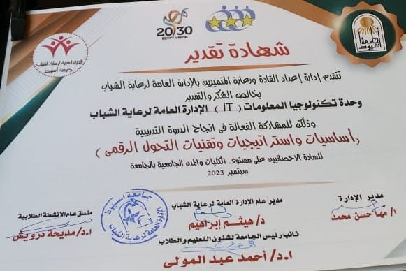 شهادة تقدير مقدمة الى وحدة تكنولوجيا المعلومات I.T رعاية الشباب المركزية