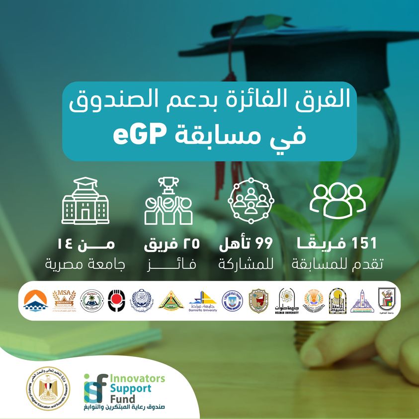 في إطار برنامج eGp الذي أطلقه صندوق رعاية المبتكرين والنوابغ نوفمبر الماضي، انطلقت رحلة تحويل مشاريع تخرج طلاب الجامعات المصرية إلى شركات ناشئة، حيث تقدم 151 فريقًا للمسابقة، وخضعوا لفترة تدريب مكثفة، تم خلالها تصفية الفرق إلى 99 فريقًا، وبعد عملية تحكيم دقيقة من جانب خبراء في التخصص ومجال ريادة الأعمال، فاز بدعم الصندوق 25 فريقًا من 14 جامعة (القاهرة، عين شمس، أسيوط، المنصورة، حلوان، سوهاج، قناة السويس، دمياط، بنها، الأكاديمية العربية للعلوم والتكنولوجيا والنقل البحري، المصرية اليابانية للعلوم والتكنولوجيا، العريش، أكتوبر للعلوم الحديثة والآداب، 6 أكتوبر)