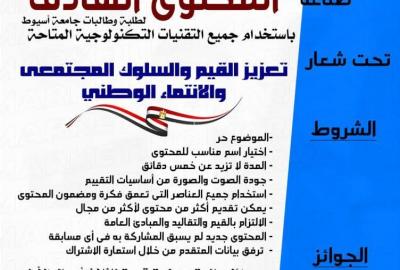 تعلن إدارة الفنون بالإدارة العامة لرعاية الطلاب عن مسابقة ( صناعة المحتوى الهادف ) لطلبة وطالبات جامعة أسيوط باستخدام جميع التقنيات التكنولوجية المتاحة تحت شعار تعزيز القيم والسلوك المجتمعى والانتماء الوطنى