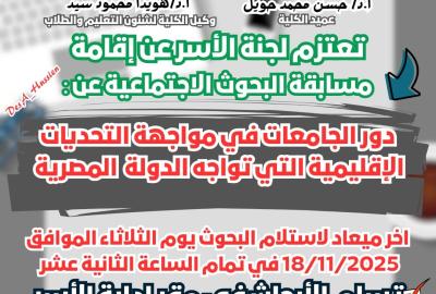 كلية التربية-تعلن لجنة الأسر بالإدارة العامة لرعاية الطلاب عن إقامة مسابقة البحوث الاجتماعية عن دور الجامعات في مواجهة التحديات الإقليمية التي تواجة الدولة المصرية.