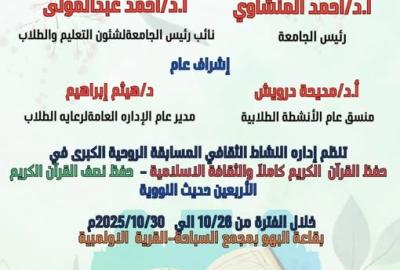 نتيجة مسابقة حفظ القرآن الكريم كاملا والثقافة الإسلامية وحفظ نصف القرآن الكريم و الاربعين حديث النووية - إدارة النشاط الثقافى بالإدارة العامة لرعاية الطلاب
