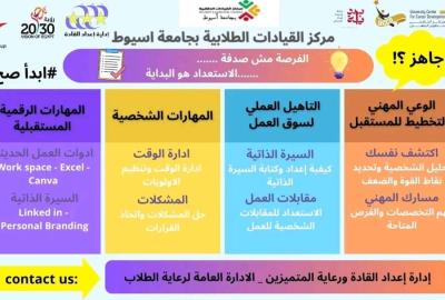 تنظم ادارة اعداد القادة بالإدارة العامة لرعاية الطلاب بالتعاون مع وزارة الشباب والرياضة ومركز القيادات الطلابية بالجامعة دورة تدريبية لطلاب الجامعة فى التاهيل لسوق العمل بالتعاون مع مركز التطوير المهني خلال الفترة من ٣٠ اكتوبر الى ٦ نوفمبر 2025