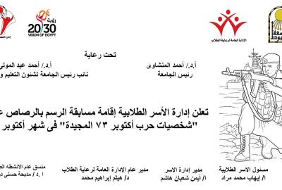 تعلن إدارة الأسر الطلابية إقامة مسابقة الرسم بالرصاص عن " شخصيات حرب أكتوبر ٧٣ المجيدة " ... إدارة الاسر الطلابية بالادارة العامة لرعاية الطلاب