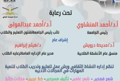 دعوة لمشاركة الطلاب والطالبات بكليات الجامعة المختلفة في ورش عمل لتعليم وتدريب الطلاب لتنمية المهارات في المجالات الاتية [ شعر فصحي _ شعر عامي _ تاليف مسرحي _ خط عربي _ مجلات حائط ] - إدارة النشاط الثقافي بالإدارة العامة لرعاية الطلاب