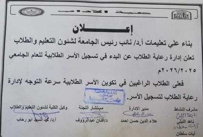 كلية الاداب-اعلان عن البدء في تسجيل الاسر الطلابية للعام الجامعي 2025 /2026