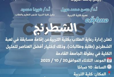 كلية التربية-تعلن عن إقامة مسابقة في لعبة الشطرنج