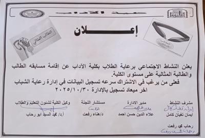 كلية الأداب-اعلان عن اقامة مسابقة الطالب والطالبة المثالية علي مستوي الكلية