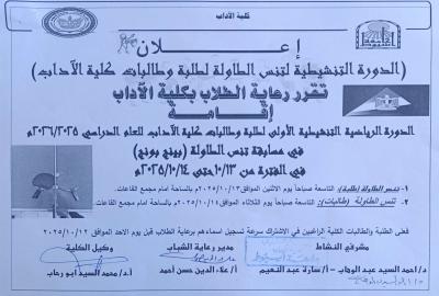 كلية الاداب-اعلان عن الدورة التنشيطية لتنس الطاولة لطلبة وطالبات كلية الاداب