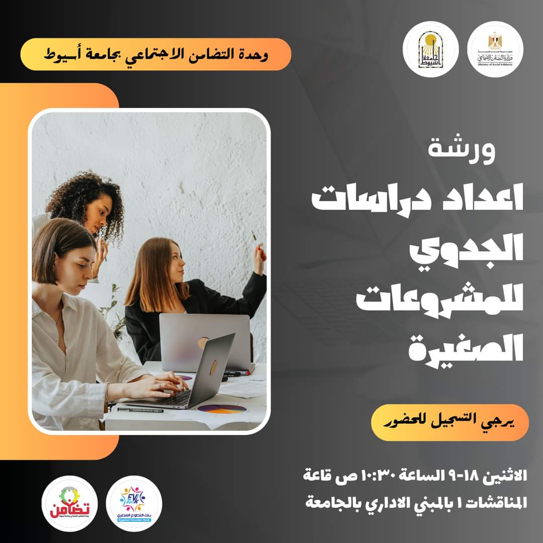 تعلن وحدة التضامن الإجتماعى بالجامعة وبالتعاون مع بنك التطوع المصري EVBank عن اقامة ورشة بعنوان "اعداد دراسات الجدوي للمشروعات الصغيرة" وذلك يوم الاثنين الموافق ١٨/ ٩/ ٢٠٢٣ الساعة العاشرة والنصف صباحا بقاعة المناقشات ١ بالمبني الاداري بالجامعة.