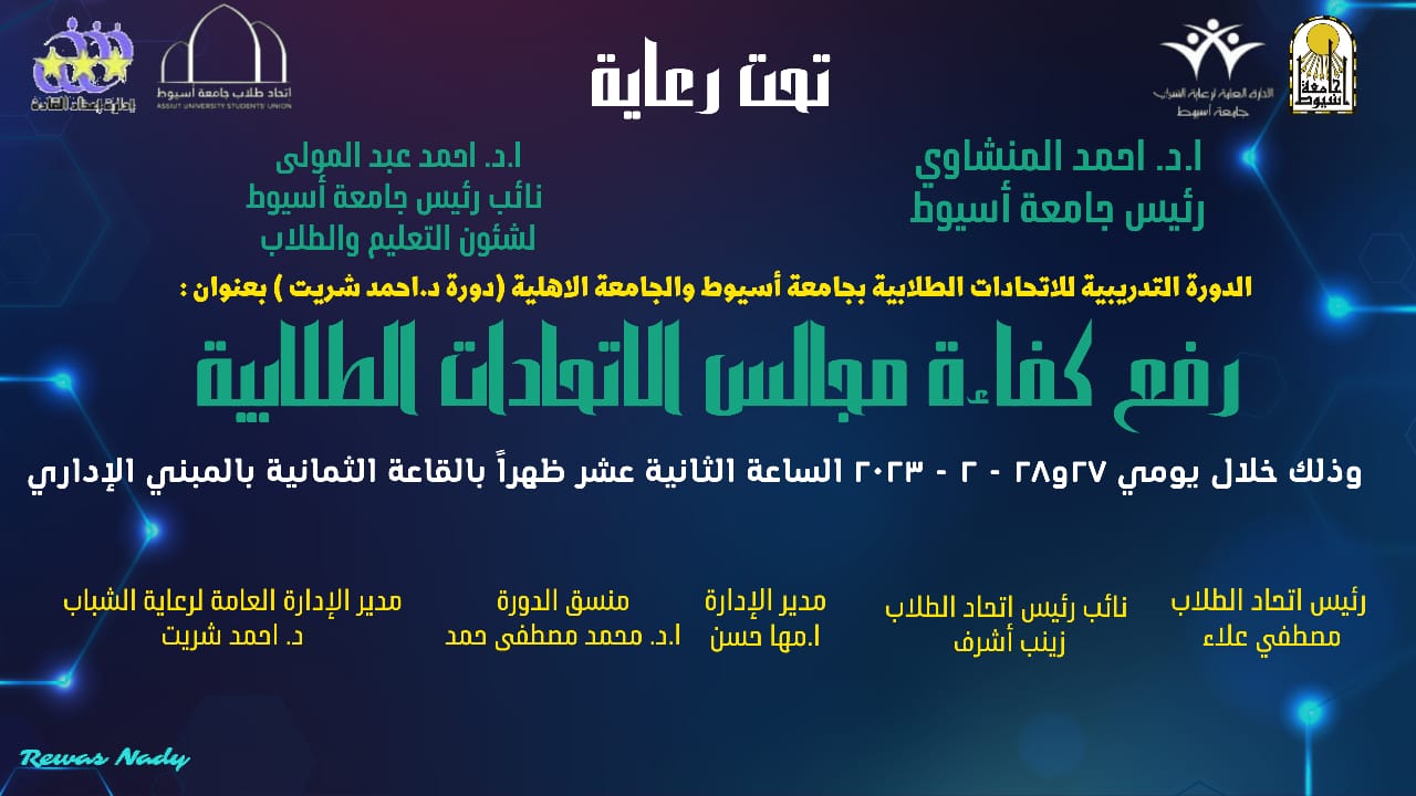 تنظم  إدارة إعداد القادة ورعاية المتميزين و ادارة الاتحادات الطلابية بالادارة العامة لرعاية الشباب المركزية  الدورة التدريبية للاتحادات الطلابية بجامعة اسيوط والجامعة الأهلية " دورة دكتور احمد شريت "بعنوان رفع كفاءة مجالس الاتحادات الطلابية وذلك خلال الفترة من ٢٧ إلى ٢٨ فبراير ٢٠٢٣م بالقاعة الثمانية الساعة الثانية عشر ظهرا