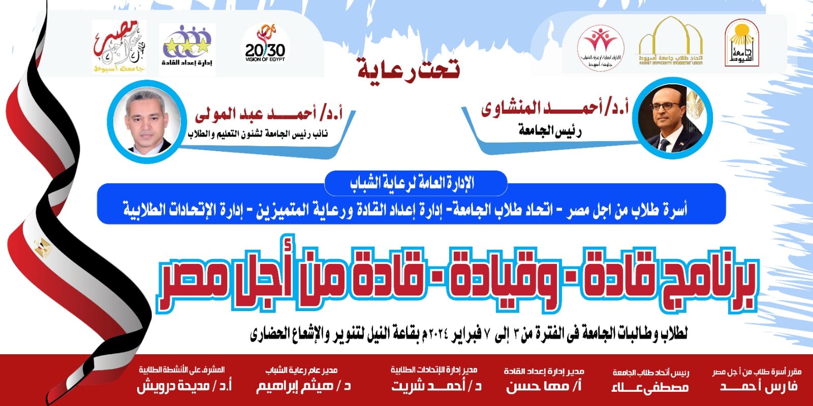 تنظم إدارة الاتحادات الطلابية وإدارة اعداد القادة بالتعاون مع اتحاد طلاب الجامعة وأسرة طلاب من أجل مصر برنامج قادة -وقيادة -قادة من أجل مصر خلال أجازة نصف العام في الفترة من ٣ فبراير حتي ٧ فبراير ٢٠٢٤