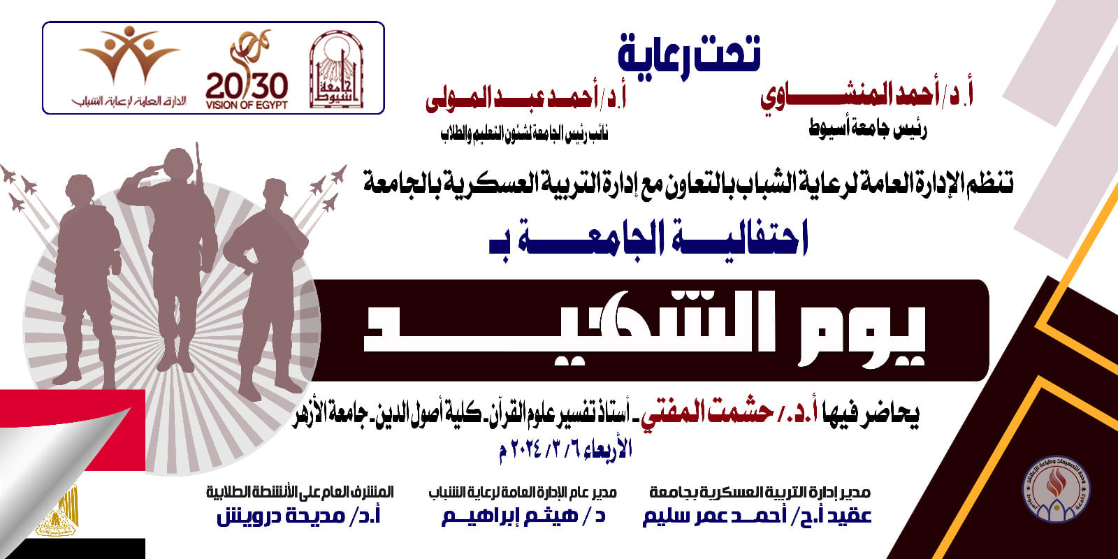 تنظم الادارة العامة لرعاية الشباب بالتعاون مع إدارة التربية العسكرية بالجامعة إحتفالية الجامعة بيوم الشهيد يحاضر فيها الاستاذ الدكتور حشمت المفتى أستاذ تفسير علوم القرأن  كلية أصول الدين جامعة الازهر وذلك يوم الاربعاء 6 مارس 2024
