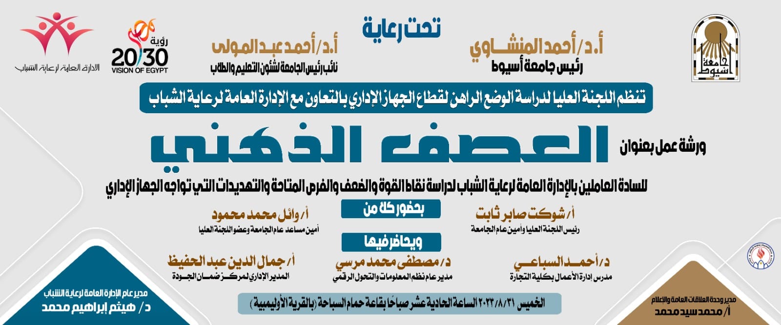 تنظم اللجنة العليا لدراسة الوضع الراهن لقطاع الجهاز الإداري بالتعاون مع الأدارة العامة لرعاية الشباب وحدة العلاقات العامه والاعلام. ..ورشة عمل بعنوان " العصف الذهني " للساده العاملين بالإدارة العامة لرعاية الشباب لدراسة نقاط القوة والضعف والفرص المتاحة والتهديدات التي تواجه الجهاز الإداري يوم الخميس الساعه ١١ صباحا الموافق ٣١ أغسطس بقاعة حمام السباحة بالقريه الأولمبية