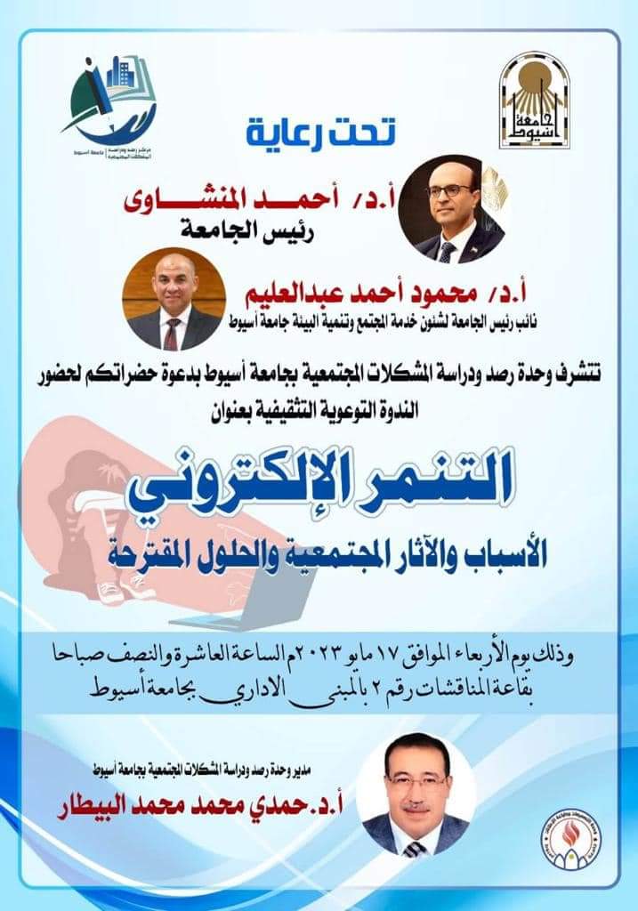 تنظم وحدة رصد ودراسة المشكلات المجتمعية بجامعة أسيوط ندوة بعنوان "التنمر الإلكتروني.. الأسباب والآثار المجتمعية والحلول المقترحة" غدا الأربعاء 17 مايو 2023م 16 مايو 2023 تنظم وحدة رصد ودراسة المشكلات المجتمعية بجامعة أسيوط ندوة بعنوان "التنمر الإلكتروني.. الأسباب والآثار المجتمعية والحلول المقترحة" غدا الأربعاء 17 مايو 2023م