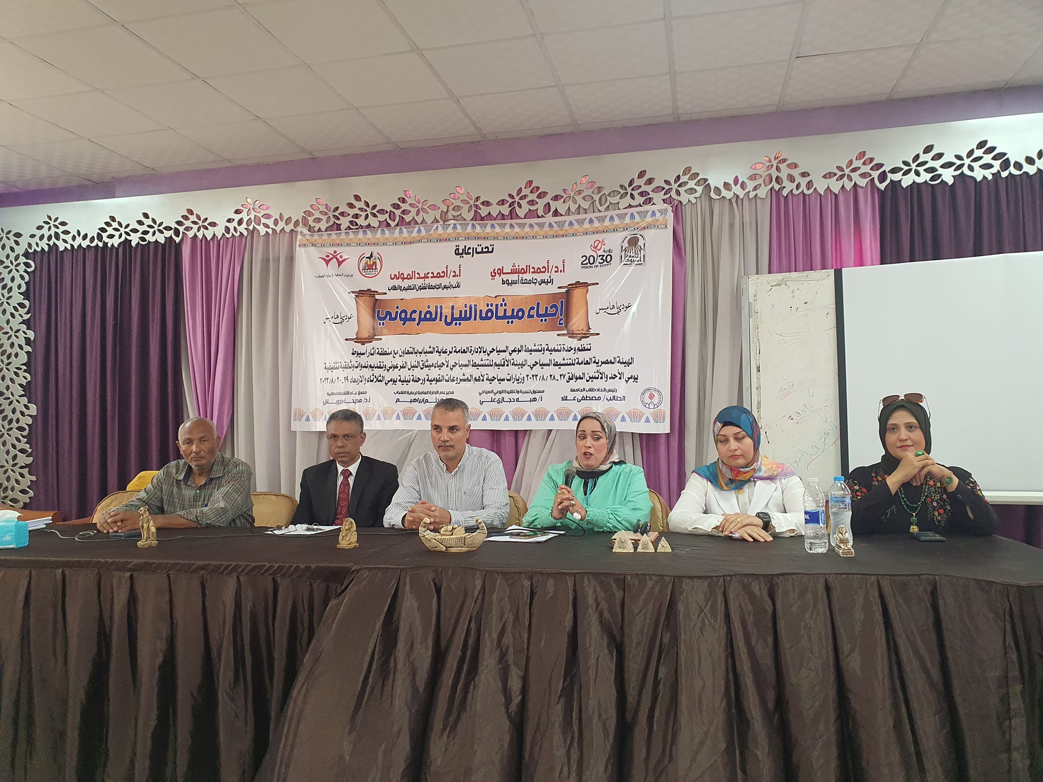 وحدة تنمية وتنشيط الوعي السياحي بالإدارة العامة لرعاية الشباب بالتعاون مع منطقة الآثار بأسيوط وهيئة الاقليم السياحي نظمت ندوتين وثائقية وتثقيفية لإحياء ميثاق النيل الفرعوني وذلك يومي الأحد والإثنين ٢٧ الى ٢٨ أغسطس بقاعة حمام السباحة باستاد الجامعة