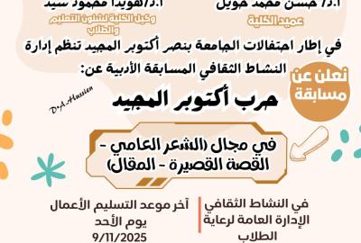 كلية التربية ... تعلن عن المسابقة الادبية عن حرب أكتوبر المجيد فى مجال ( الشعر العامي، القصة القصيرة، المقال )