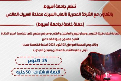 اعلان .. تنظم جامعة اسيوط بالتعاون مع الشركة المصرية لألعاب السيرك العالمي حفلة خاصة للجامعة