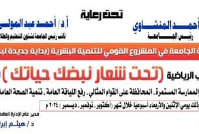 دعوة لمشاركة طلبة وطالبات الجامعة بمراكز التدريب الرياضية تحت شعار " نبضك حياتك " إدارة نشاط اللياقة البدنية بالإدارة العامة لرعاية الطلاب.