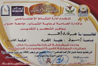 إدارة النشاط الاجتماعى بالإدارة العامة لرعاية الطلاب فوز جامعة أسيوط بالمركز الثالث فى المسابقة القمية للموضوعات الاجتماعية على مستوى الجامعات المصرية المقامة بجامعة حلوان خلال العام الجامعى 2023/ 2024م