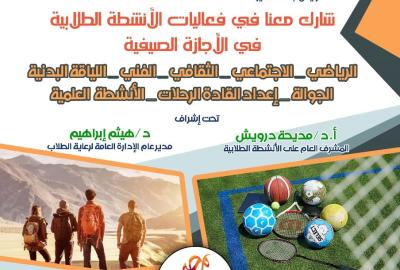 كلية الاداب .. إدارة رعاية الشباب ... إقامة المعسكر الصيفي لطلاب الكلية بالتعاون مع أسرة اترك بصمة تحت شعار (شباب اليوم هو مستقبل الغد) وهو معسكر خدمى يهدف إلى رفع كفاءة الطلاب وذلك بقاعة (١٧)و(١٨)بكلية الآداب خلال الفتره من ا /٧ حتى ١٥ /٧ /٢٠٢٤م