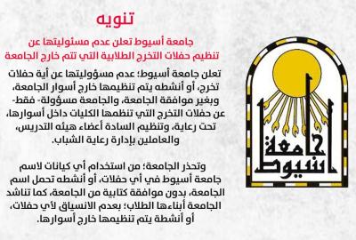 جامعة أسيوط تعلن عدم مسئوليتها عن تنظيم حفلات التخرج الطلابية التي تتم خارج الجامعة