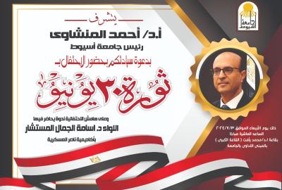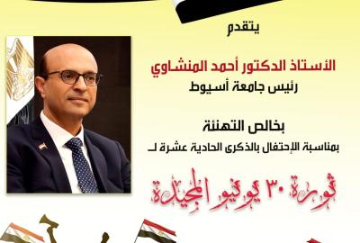 يتقدم الأستاذ الدكتور أحمد المنشاوي رئيس جامعة أسيوط؛ بأصدق التهاني القلبية بمناسبة الذكرى الحادية عشرة لثورة 30 يونيو