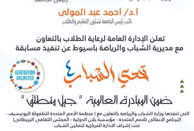 إدارة الاتحادات الطلابية بالإدارة العامة لرعاية الطلاب دعوة لمشاركة الطلاب والطالبات في مسابقة( تحدي الشباب ٤ )ضمن المبادرة العالمية " جيل منطلق " التي تنفيذها وزارة الشباب والرياضة بالتعاون مع ( منظمة الأمم المتحدة للطفولة اليونيسيف - البرنامج الانمائى