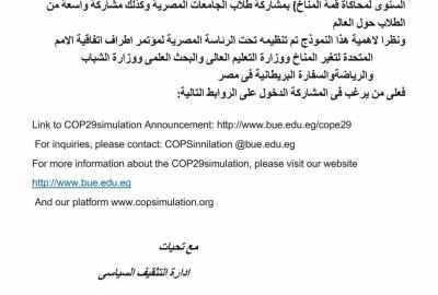 إدارة التثقيف السياسى .... تنظم الجامعة البريطانية بالقاهرة بالتعاون مع البرنامج الإنمائي للأمم المتحدة (النموذج السنوي لمحاكاة قمة المناخ) بمشاركة طلاب الجامعات المصرية وكذلك مشاركة من الطلاب حول العالم.
