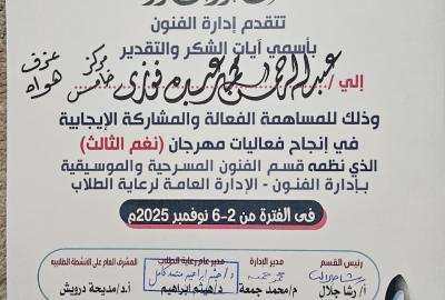 كلية التربية النوعية-حصول طلاب الكلية علي بعض المراكز المتقدمة في مسابقة مهرجان (نغم) الذي نظمتة الادارة العامة لرعاية الطلاب.