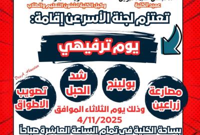 كلية التربية-تعلن لجنة الأسر عن إقامة مسابقه لطلاب الكلية تحت عنوان "يوم ترفيهي"