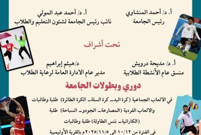 دعوة لمشاركة الطلاب والطالبات بكليات الجامعة المختلفة في دوري وبطولات الجامعة في الألعاب الجماعية والألعاب الفردية - أدارة النشاط الرياضى بالإدارة العامة لرعاية الطلاب