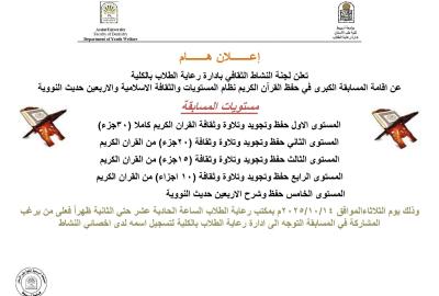 كلية طب الأسنان - تعلن اللجنة الثقافية عن إقامة مسابقة القرآن الكريم